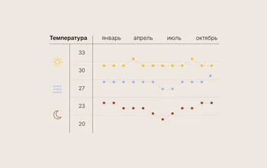 Сухой сезон, который считается лучшим временем для посещения, длится с апреля по октябрь. Средняя температура воздуха в это время составляет 25-33°C, а влажность – от 60 до 80%.