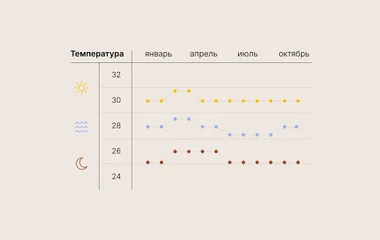 Лучшее время для посещения с точки зрения погоды – с декабря по апрель, когда стоит сухая и жаркая погода с небольшим количеством осадков и ветров. С мая по октябрь длится сезон дождей, ливни короткие, но очень обильные.